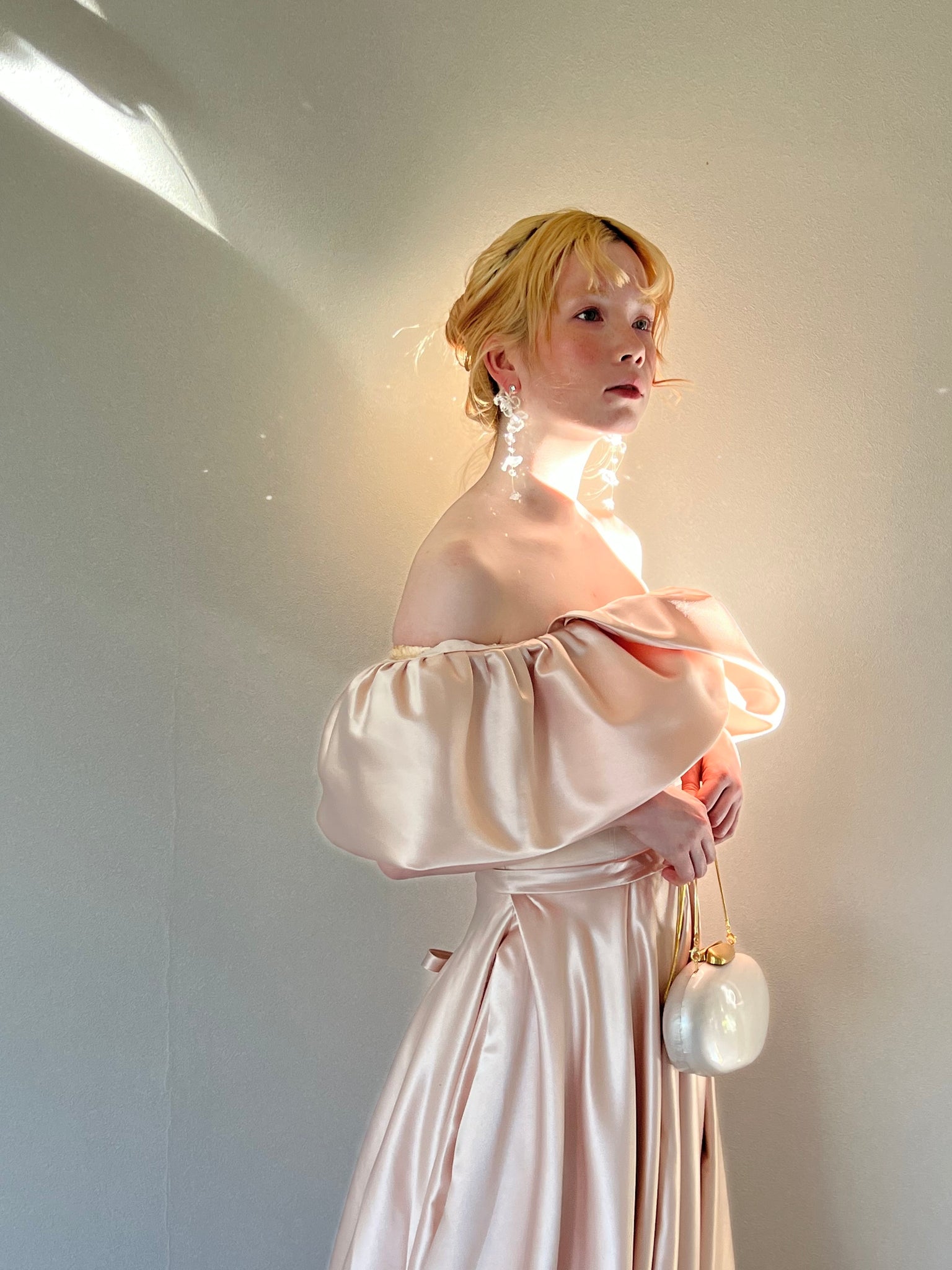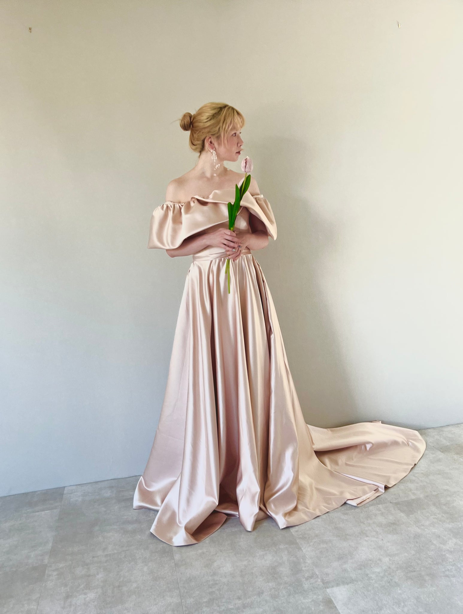 品のある艶感のブライダルサテン生地が大人っぽいドレスです。