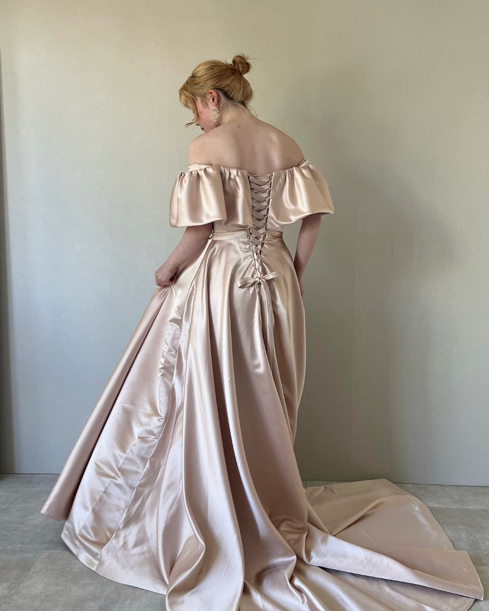 Aラインでふんわりとしたデザイン感のあるオフショルダーは気になる部分を綺麗にカバーしてくれる安心のデザインです。