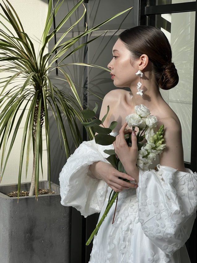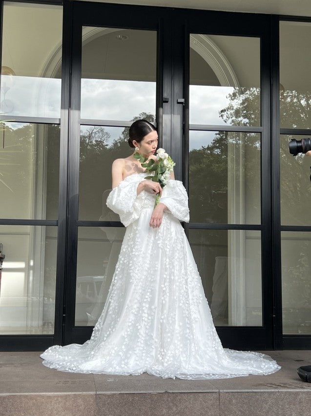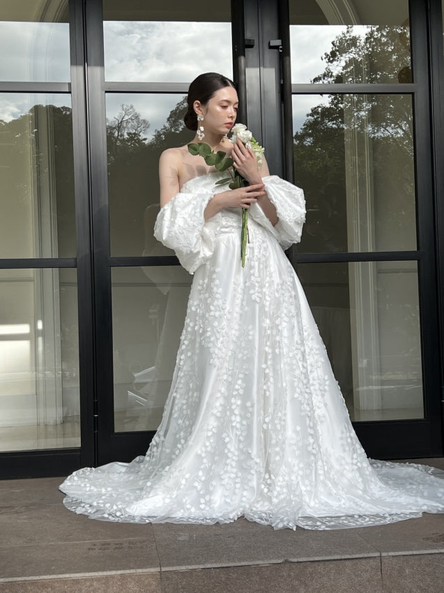 繊細な総レースを贅沢に使用し、クラシカルでありながら都会的なモード感も漂う一着です。顔周りを華やかに見せるデザインは、お色直しはもちろん、フォトウェディングやレストランウェディングでも、凛とした花嫁姿を演出します。